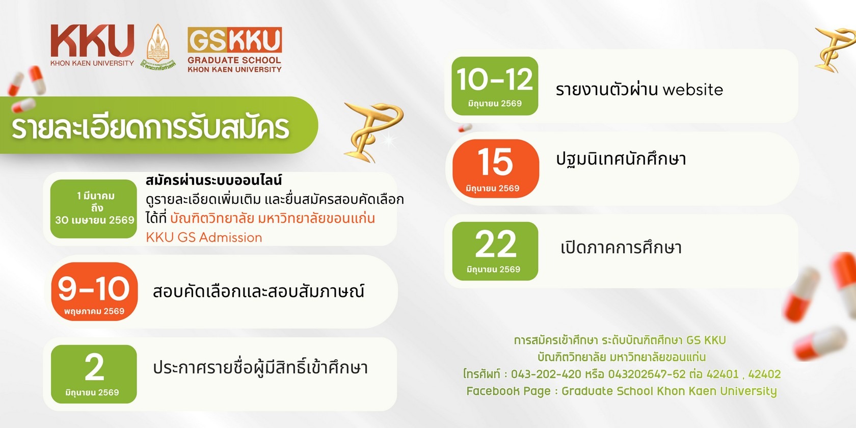 ดูรายละเอียดเพิ่มเติม และยื่นสมัครสอบคัดเลือก ได้ที่ บัณฑิตวิทยาลัย มหาวิทยาลัยขอนแก่น KKU GS Admission