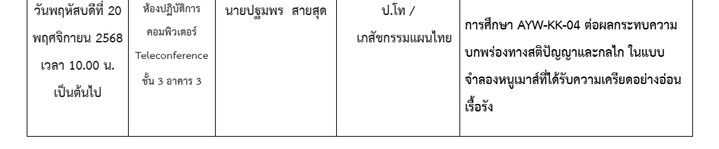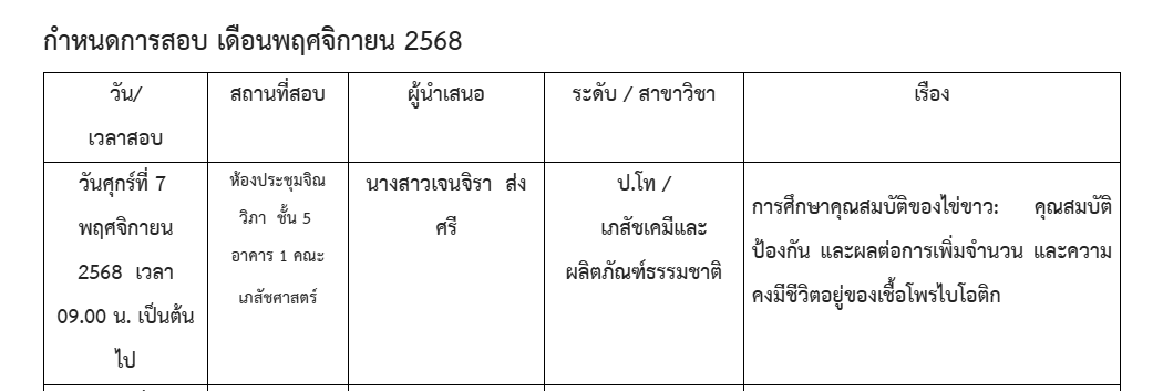 ขอเชิญ คณาจารย์ นักศึกษาระดับบัณฑิตศึกษาและผู้สนใจร่วมฟังการสอบวิทยานิพนธ์ เดือน พฤศจิกายน 2568