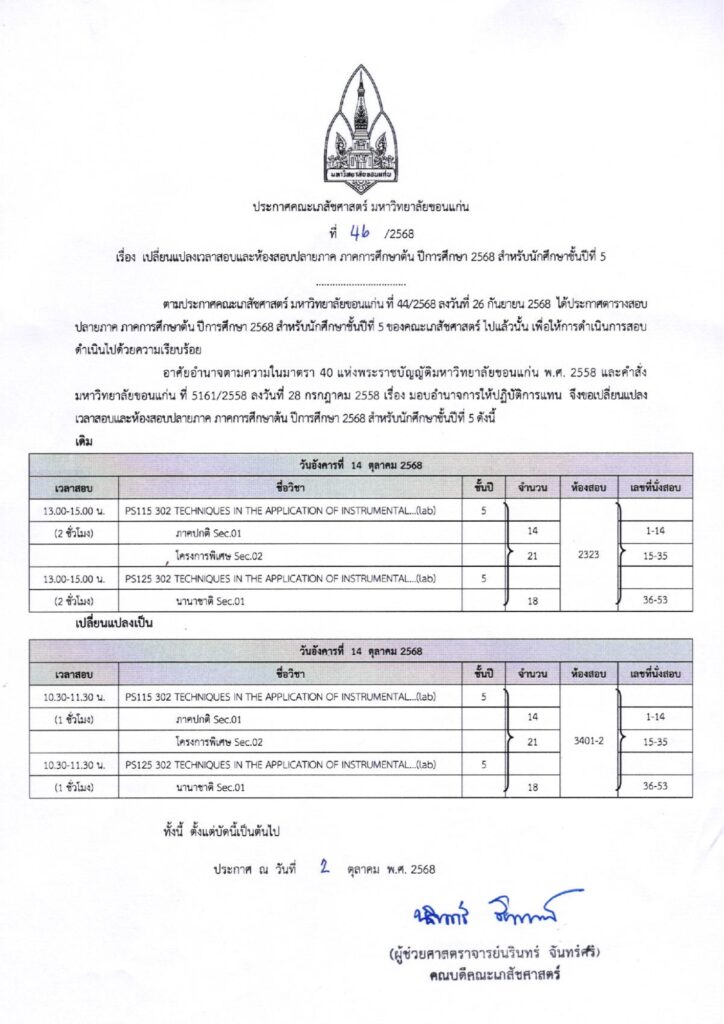 ประชาสัมพันธ์ ประกาศฯ เปลี่ยนแปลงเวลาสอบและห้องสอบปลายภาค ภาคการศึกษาต้น ปีการศึกษา 2568 สำหรับนักศึกษาชั้นปีที่ 5