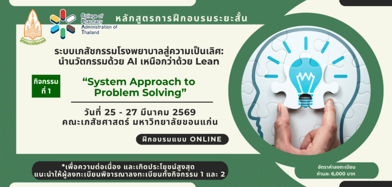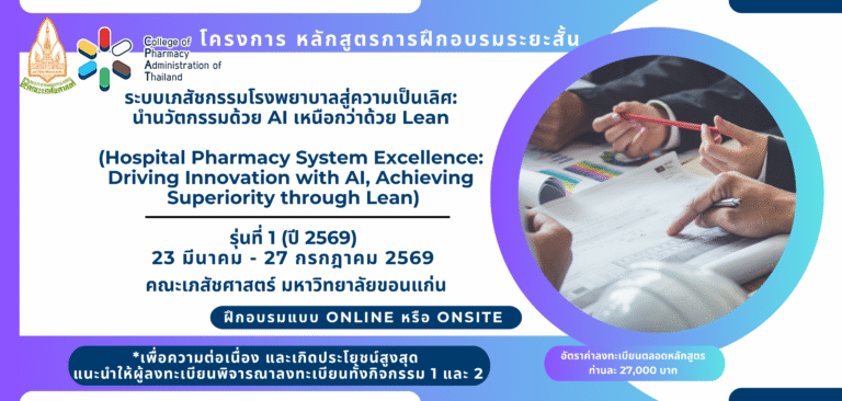 ข่าวประชาสัมพันธ์ประชุมวิชาการ / อบรมระยะสั้นหลักสูตรฝึกอบรมระยะสั้น กิจกรรมที่ 1 System approach to problem solving (ภายใต้โครงการหลักสูตร ระบบเภสัชกรรมโรงพยาบาลสู่ความเป็นเลิศ: นำนวัตกรรมด้วย AI เหนือกว่าด้วย Lean Short Course Training Program in Hospital Pharmacy System Excellence: Driving Innovation with AI, Achieving Superiority through Lean รุ่นที่ 1 (ปี 2569) (ฝึกอบรมแบบ Online)5 พฤศจิกายน 20255 พฤศจิกายน 2025หลักสูตรฝึกอบรมระยะส […]Read more