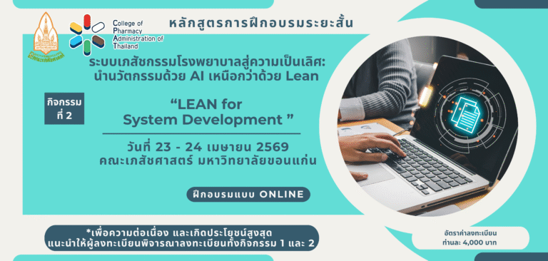 ข่าวประชาสัมพันธ์ประชุมวิชาการ / อบรมระยะสั้นหลักสูตรฝึกอบรมระยะสั้น กิจกรรมที่ 2 LEAN for System Development (ภายใต้โครงการหลักสูตร ระบบเภสัชกรรมโรงพยาบาลสู่ความเป็นเลิศ: นำนวัตกรรมด้วย AI เหนือกว่าด้วย Lean Short Course Training Program in Hospital Pharmacy System Excellence: Driving Innovation with AI, Achieving Superiority through Lean รุ่นที่ 1 (ปี 2569) (ฝึกอบรมแบบ Online)5 พฤศจิกายน 20255 พฤศจิกายน 2025หลักสูตรฝึกอบรมระยะส […]Read more